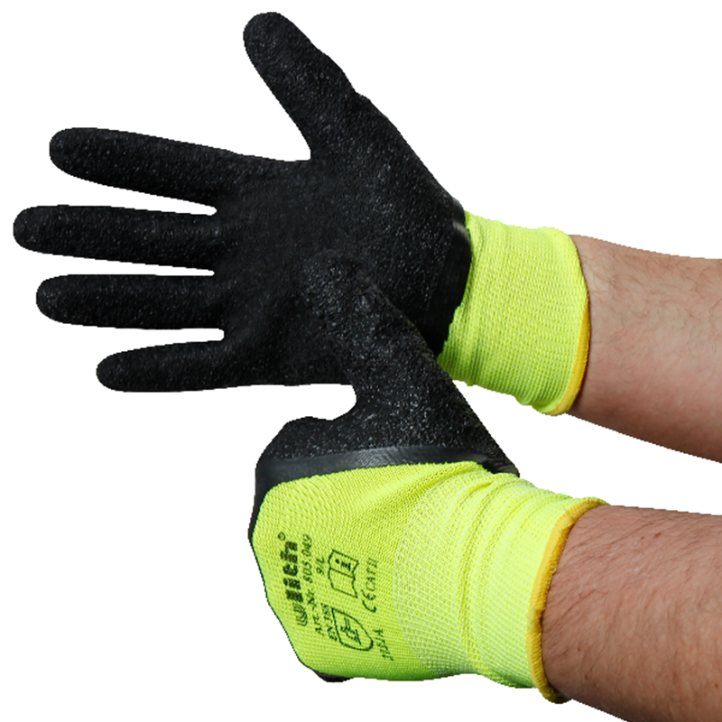 • Montage-Latex-Feinstrickhandschuhe • warngelbes-13G Trägermaterial • schwarze... mehr