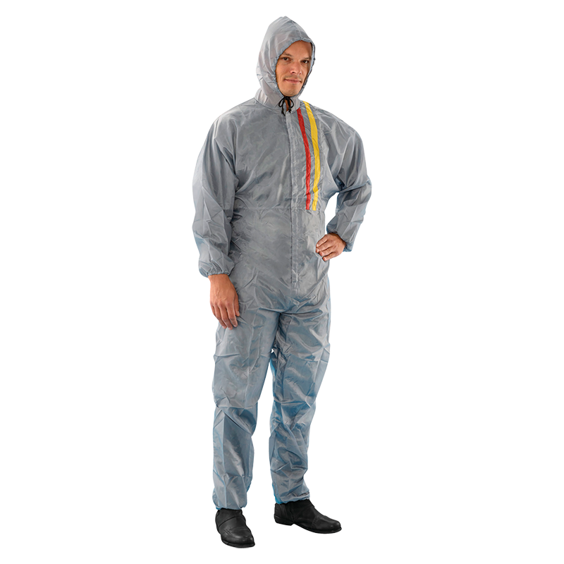 grauer Mehrwegoverall mit Kapuze und Reißverschluss