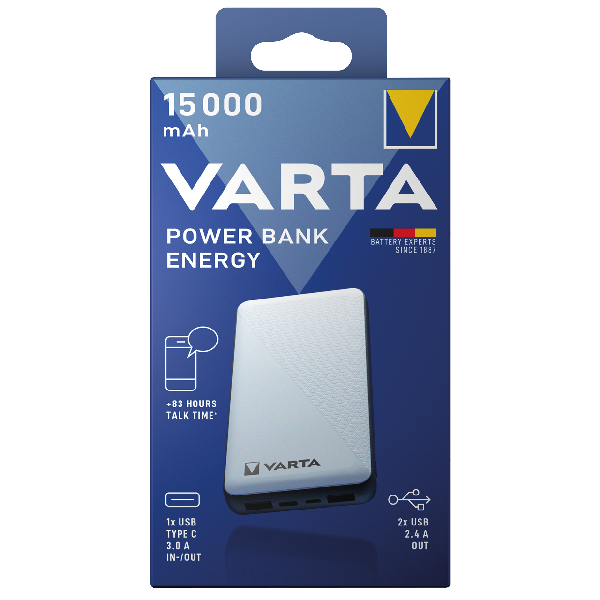 Produktinformationen "Akku Powerbank, VARTA, 5V/15.000mAh, Energy, weiß, 2xUSB-A/Micro-B/-C"