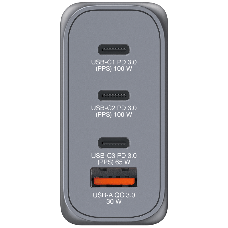 • Leistung der einzelnen Anschlüsse: Leistung USB-C1 PD 3.0: 3,3–21 V ¿ 5 A, 5 V ¿ 3 A, 9 V ¿ 3 A, 12 V ¿ 3 A, 15 V ¿ 3 A, 20 V ¿ 5 A (100 W max.), Leistung USB-C2 PD 3.0: 3,3–21 V ¿ 5 A, 5 V ¿ 3 A, 9 V ¿ 3 A, 12 V ¿ 3 A, 15 V ¿ 3 A, 20 V ¿ 5 A (100 W max.), Leistung USB-C3 PD 3.0: 3,3–11 V ¿ 5 A, 5 V ¿ 3 A, 9 V ¿ 3 A, 12 V ¿ 3 A, 15 V ¿ 3 A, 20 V ¿ 3,25 A (65 W max.), Leistung USB-A QC 3.0: 4,5 V ¿ 5 A, 5 V ¿ 4,5 A, 5 V ¿ 3 A, 9 V ¿ 3 A, 12 V ¿ 2,5 A, 20 V ¿ 1,5 A (30 W max.)
