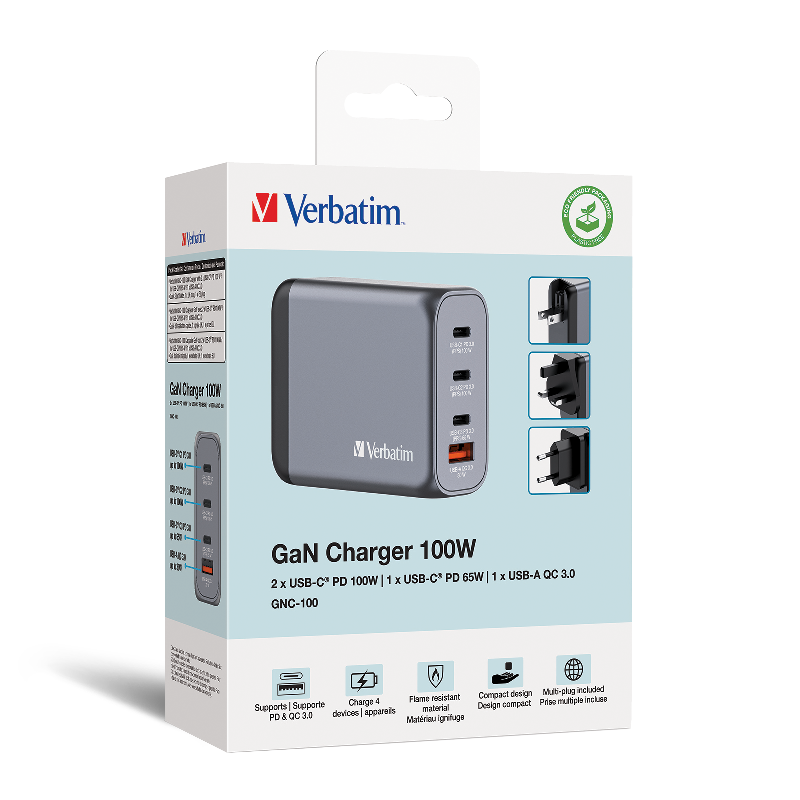 Weiterführende Links zu "Ladeadapter Verbatim, Universal,GNC-100, GaN, 100W,grau,1x USB-A QC, 3x USB-C PD"
