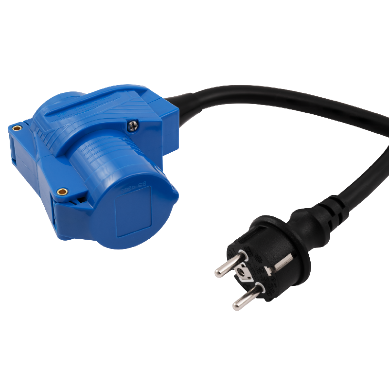 • CEE-Adapter D1911 mit Schutzkontak-Kupplung und CEE-Kupplung mit Schutzdeckel auf Schutzkontakt-Stecker