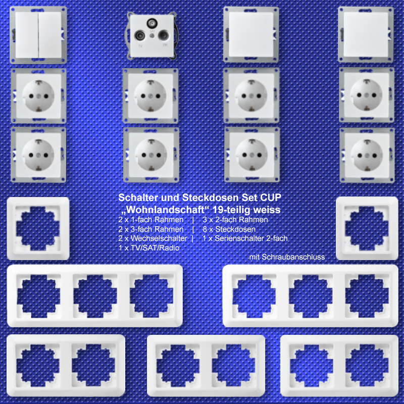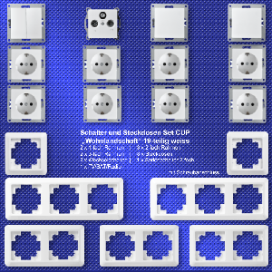 • 1x Serienschalter • 2x Wechselschalter • 8x Steckdose • 1x Antenndose • 2x Rahmen 3fach • 3x Rahmen 2fach • 2x Rahmen 1fach