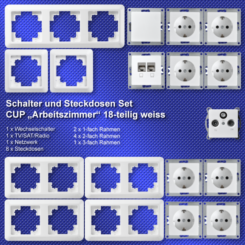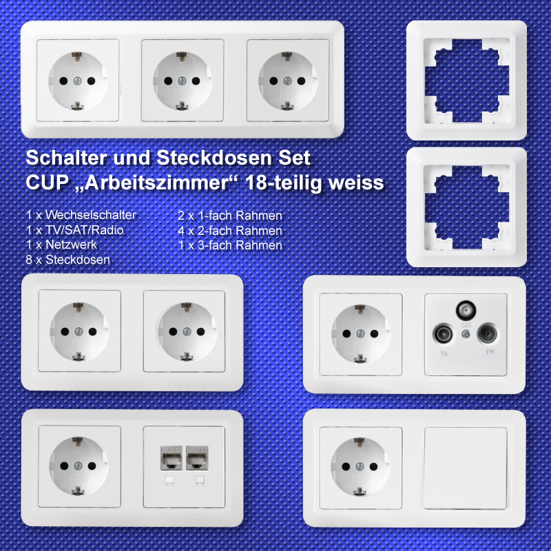 • 1x Wechselschalter • 8x Steckdose • 1x Antenndose • 1x Netzwerkdose • 1x Rahmen 3fach • 4x Rahmen 2fach • 2x Rahmen 1fach