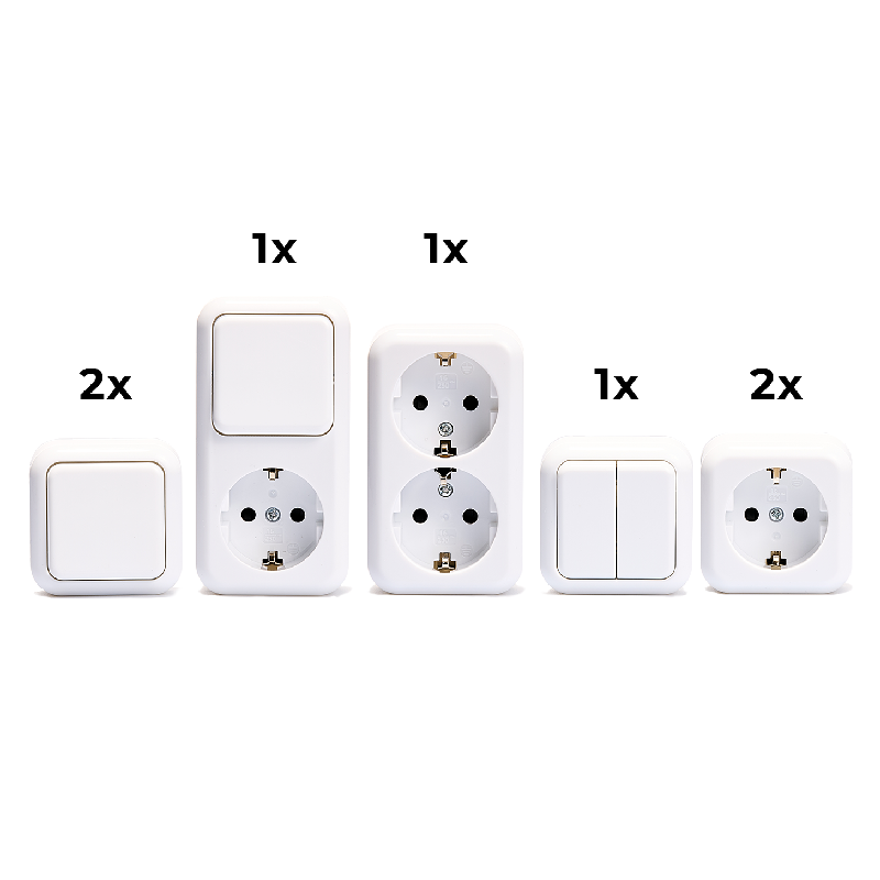 2x Wechselschalter1x Serienschalter2x Schutzkontaktsteckdose1x Schutzkontaktsteckdose 2-fach1x Wechselschalter & Steckdosenkombination