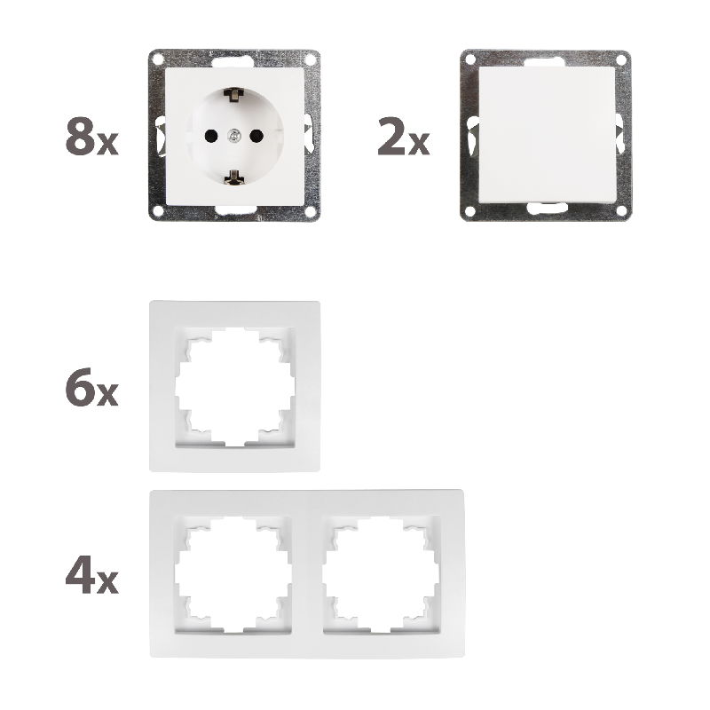 • 2x Wechselschalter 1534800 • 8x Steckdose 1534804 • 4x Rahmen 2fach 1534809 • 6x Rahmen 1fach 1534808