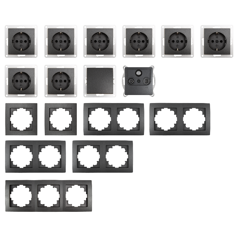 • 1x Wechselschalter • 8x Steckdose • 1x Antenndose • 1x Rahmen 3fach • 4x Rahmen 2fach • 2x Rahmen 1fach