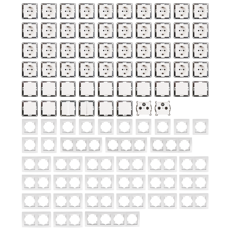 12x Wechselschalter, 40x Steckdose, 2x Taster, 2x Serien-Schalter, 2x Antennendose, 12x 1-fach Rahmen, 20x 2-fach Rahmen, 4x 3-fach Rahmen, 1x 4-fach Rahmen