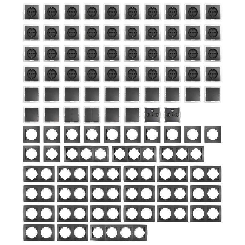 12x Wechselschalter, 40x Steckdose, 2x Taster, 2x Serien-Schalter, 2x Antennendose, 12x 1-fach Rahmen, 20x 2-fach Rahmen, 4x 3-fach Rahmen, 1x 4-fach Rahmen