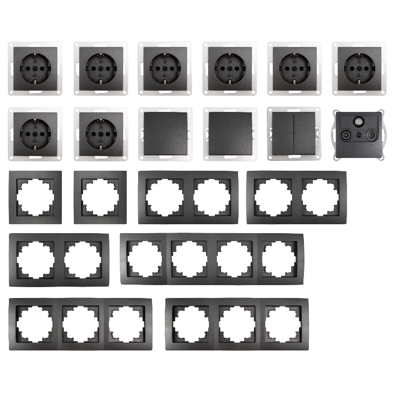 • 1x Serienschalter • 2x Wechselschalter • 8x Steckdose • 1x Antenndose • 1x Rahmen 4fach • 2x Rahmen 3fach • 3x Rahmen 2fach • 2x Rahmen 1fach