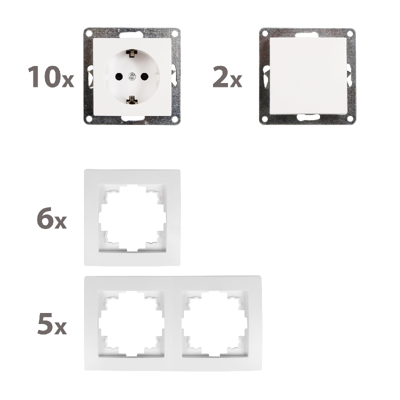 • 2x Wechselschalter 1534800 • 10x Steckdose 1534804 • 5x Rahmen 2-fach 1534809 • 6x Rahmen 1-fach 1534808