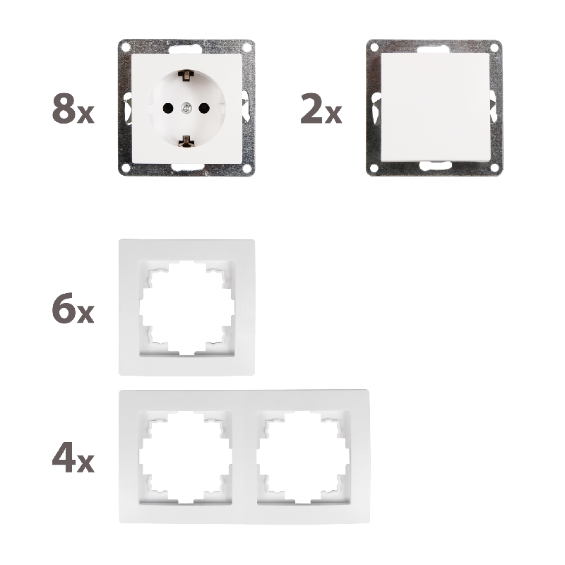 • 2x Wechselschalter 1534868 • 8x Steckdose 1534867 • 4x Rahmen 2fach 1534809 • 6x Rahmen 1fach 1534808