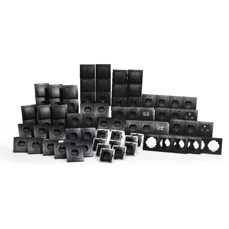 50x Steckdose, 10x Wechselschalter, 4x Serien-Schalter, 2x Antennendose, 2x Netzwerkdose, 10 Rahmen 1-fach, 10x Rahmen 2-fach, 10x Rahmen 3-fach, 2x Rahmen 4-fach