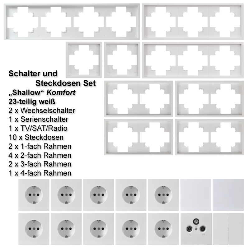 1x Serien-Schalter, 2x Wechselschalter, 10x Steckdose, 1x Antennendose, 1x Rahmen 4-fach, 2x Rahmen 3-fach, 4x Rahmen 2-fach, 2x Rahmen 1-fach