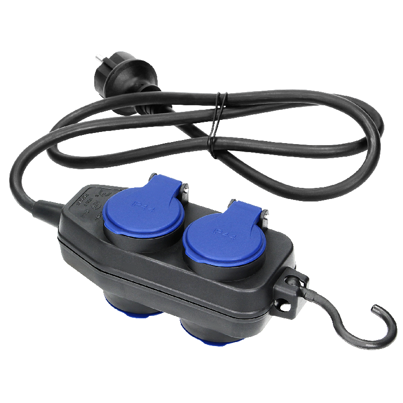 • Stromverlängerungskabel aus einer schweren Gummischlauchleitung mit Schutzkappe