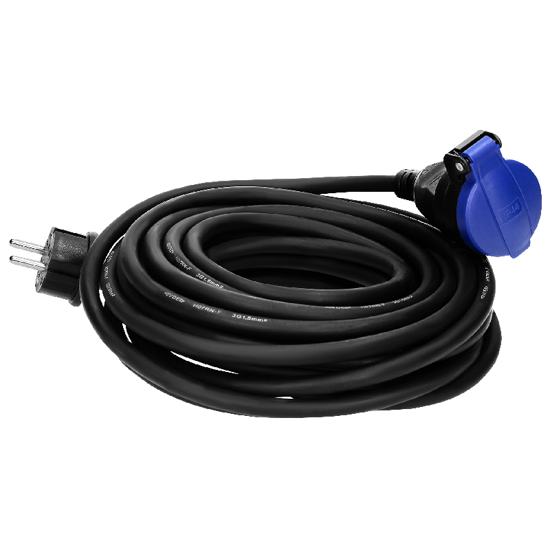 • Stromverlängerungskabel aus einer schweren Gummischlauchleitung mit Schutzkappe