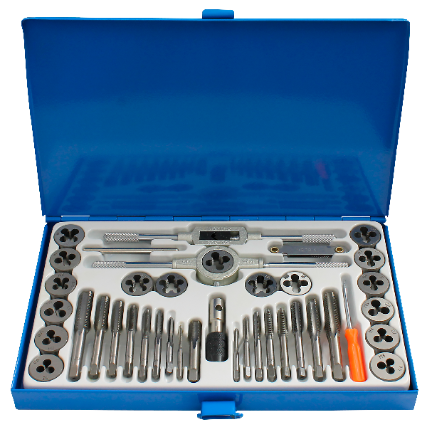 • Inhalt: Gewindebohrer für Grob- und Feingewinde: M3: M4: M5: M6: M7: M8: M10: M12: 1/8'' NPT 27, Schneideisen für Grob- und Feingewinde: M3: M4: M5: M6: M7: M8: M10: M12: 1/8'' NPT 27, 1 Schneideisenhalter, 1 Verstellbares Windeisen, 1 Werkzeughalter, 1 Gewindelehre, 1 Schlitzschraubendreher 6 mm