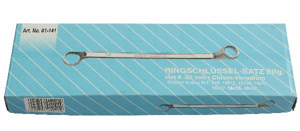 • Schlüsselweiten: 6 x 7 mm, 8 x 9 mm, 10 x 11 mm, 12 x 13 mm, 14 x 15 mm, 16 x 17 mm, 18 x 19 mm, 20 x 22 mm